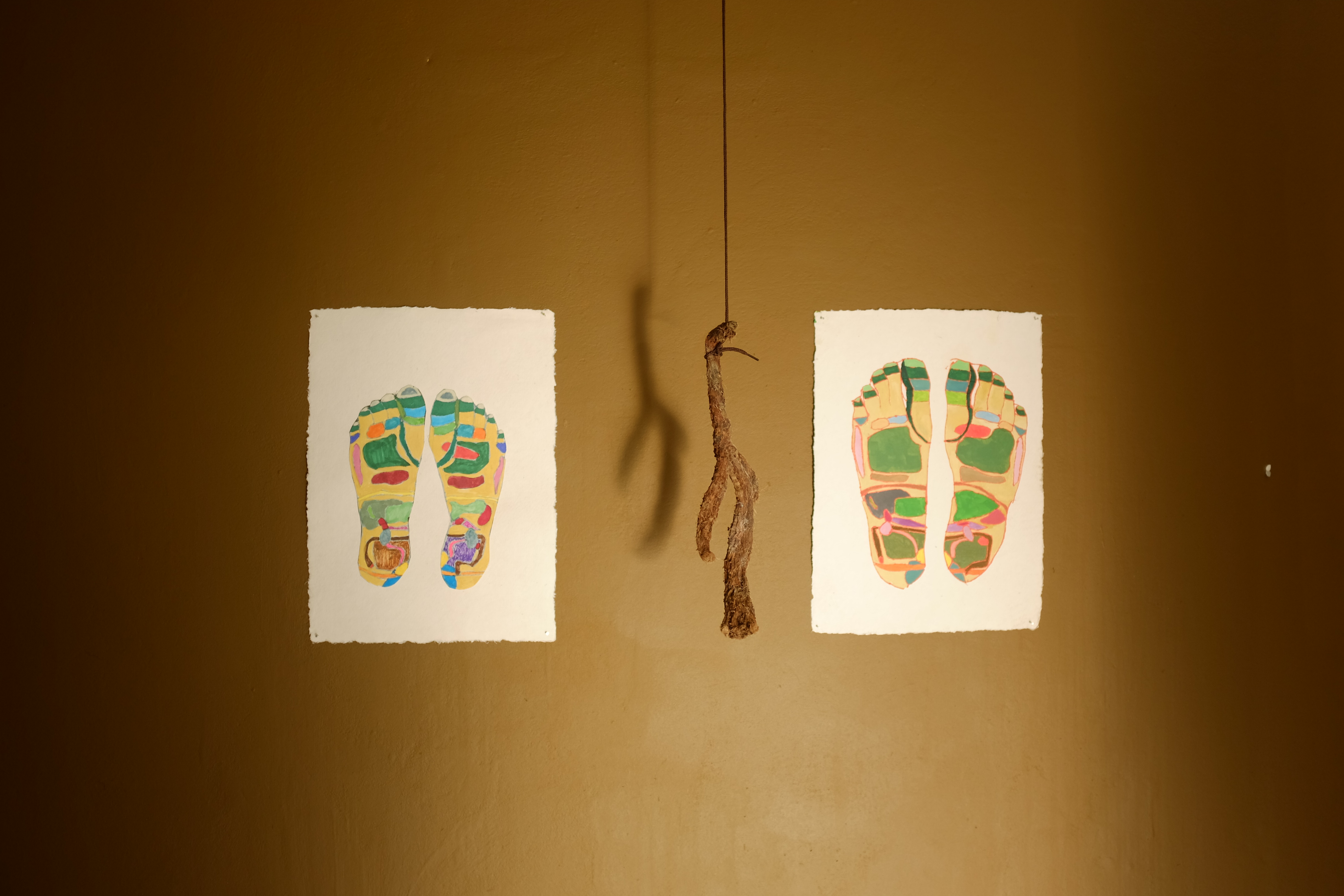Felt tip, acrylic paint, and collage on handmade paper, with found botanical suspended by shoelace