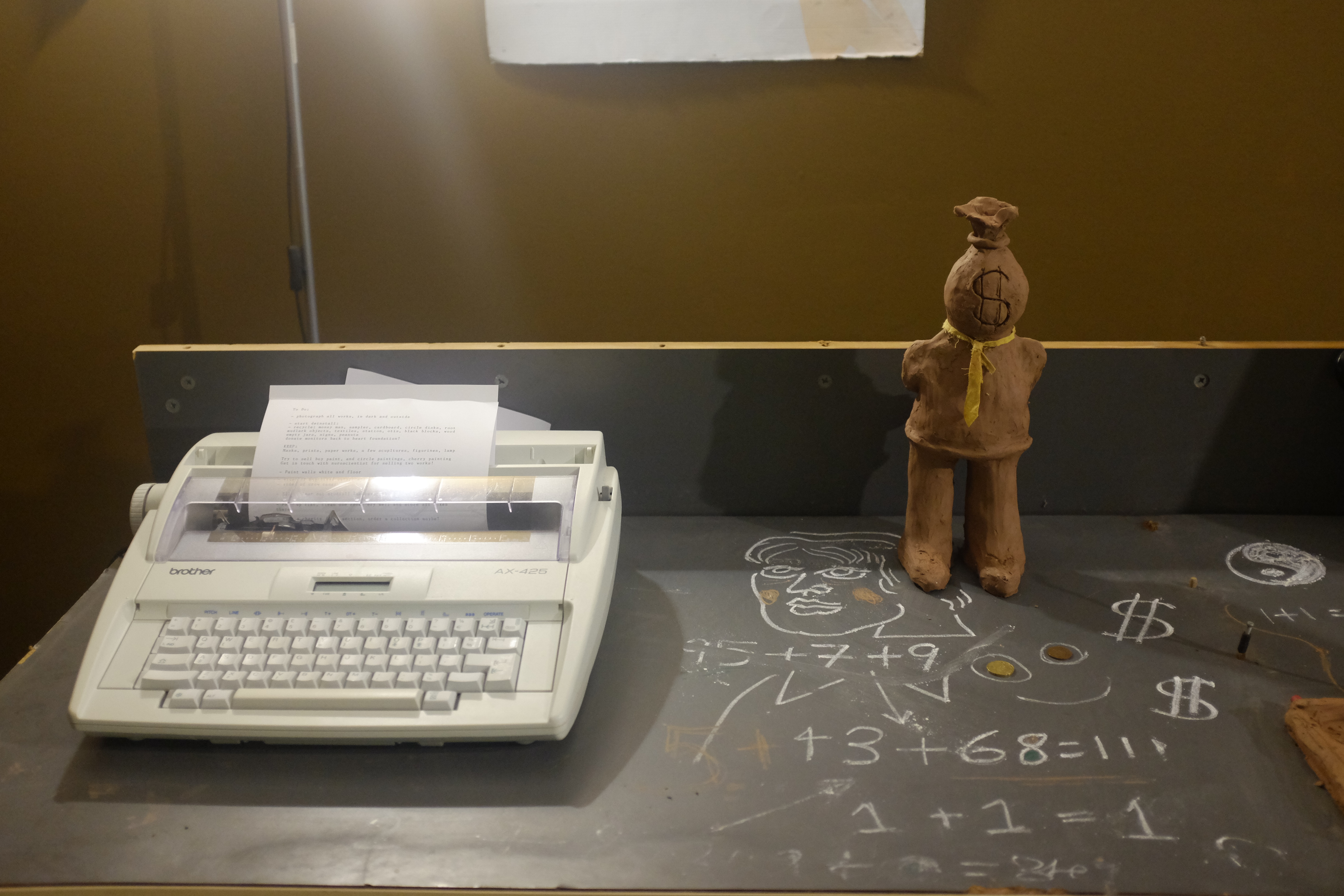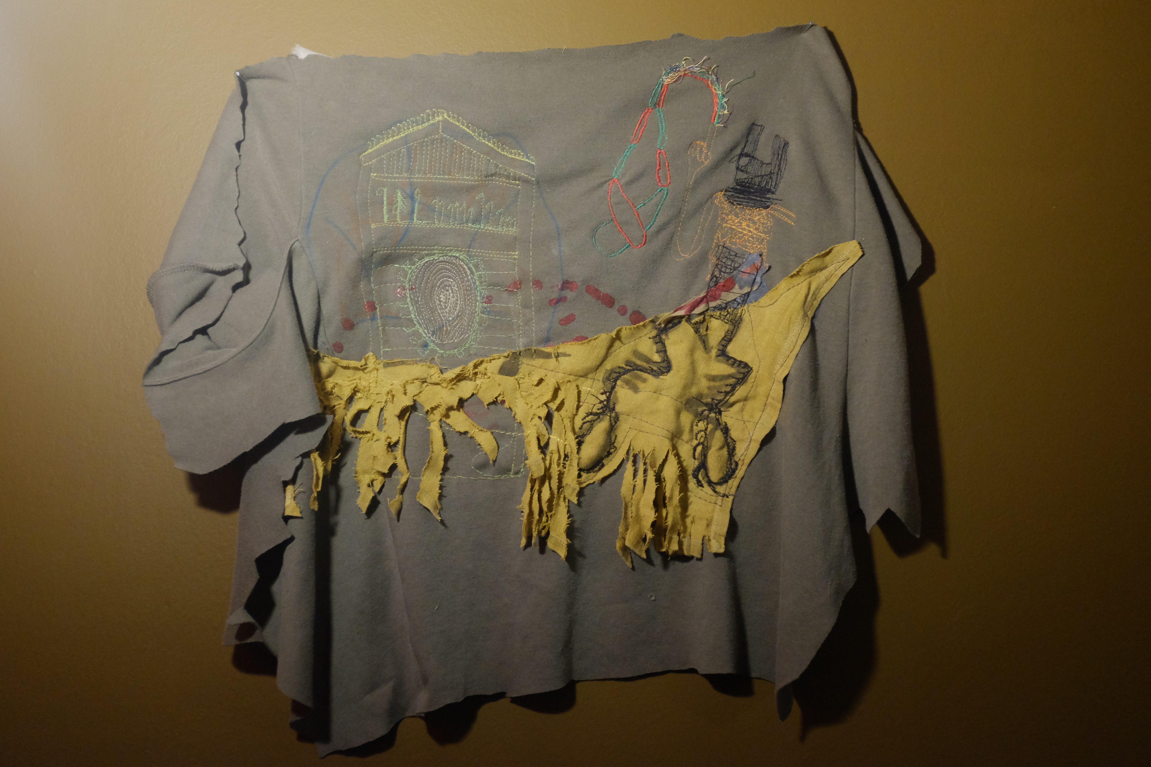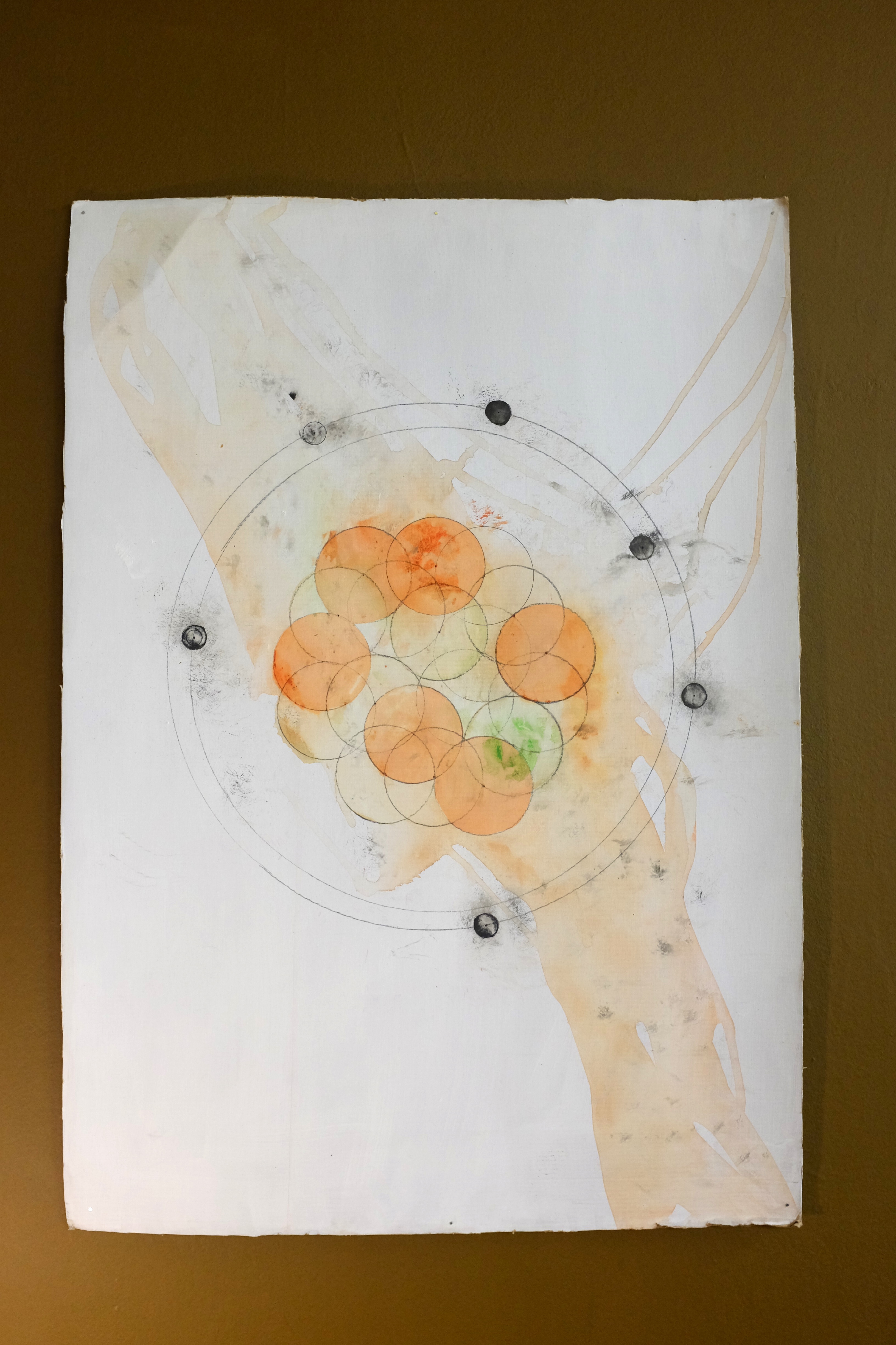 Felt tip, acrylic paint, and collage on handmade paper, with found botanical suspended by shoelace